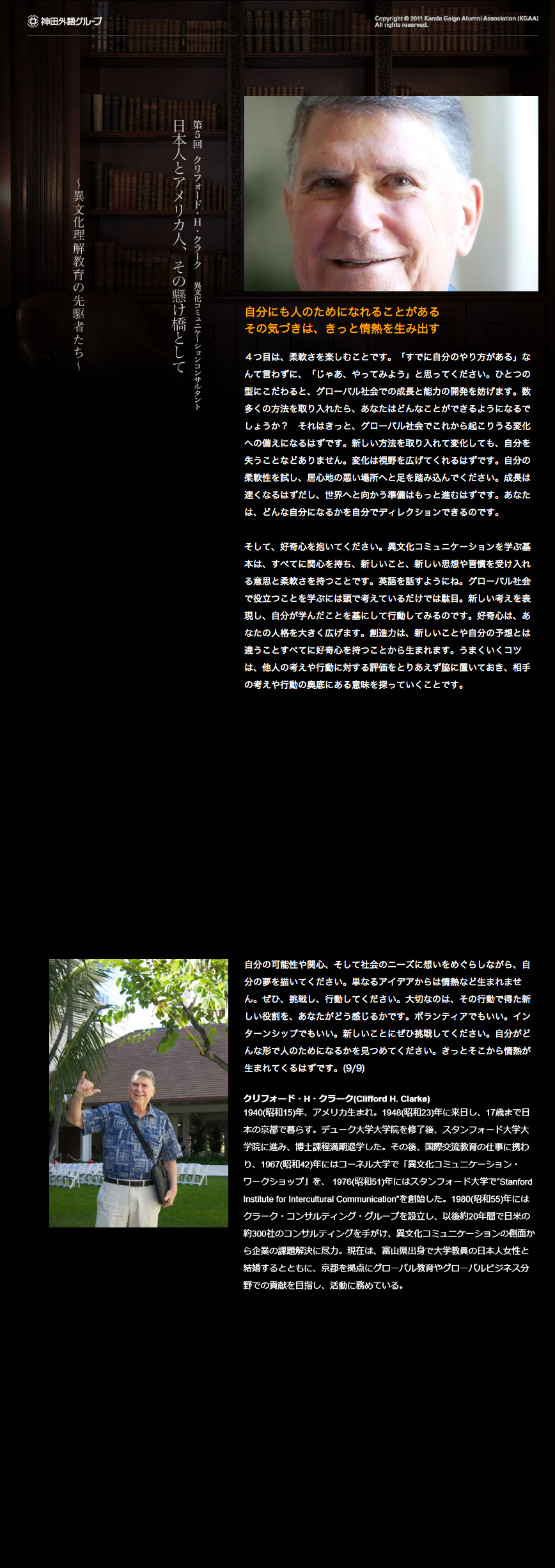 1940(昭和15)年、アメリカ生まれ。1948(昭和23)年に来日し、17歳まで日本の京都で暮らす。デューク大学大学院を修了後、スタンフォード大学大学院に進み、博士課程満期退学した。その後、国際交流教育の仕事に携わり、1967(昭和42)年にはコーネル大学で「異文化コミュニケーション・ワークショップ」を、 1976(昭和51)年にはスタンフォード大学で“Stanford Institute for Intercultural Communication”を創始した。1980(昭和55)年にはクラーク・コンサルティング・グループを設立し、以後約20年間で日米の約300社のコンサルティングを手がけ、異文化コミュニケーションの側面から企業の課題解決に尽力。現在は、富山県出身で大学教員の日本人女性と結婚するとともに、京都を拠点にグローバル教育やグローバルビジネス分野での貢献を目指し、活動に務めている。