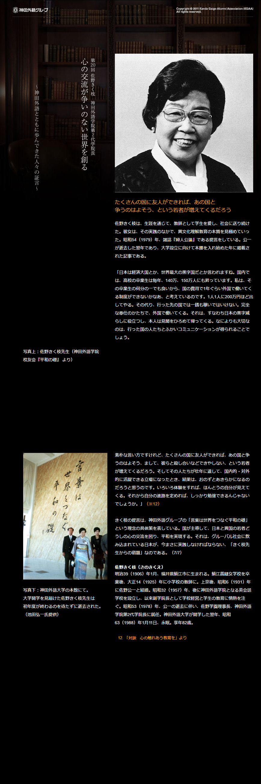 きく枝の提言は、神田外語グループの「言葉は世界をつなぐ平和の礎」という理念の具体策を表している。国が主導して、日本と異国の若者どうしの心の交流を図り、平和を実現する。それは、グルーバル社会に飲み込まれている日本が、今まさに実践しなければならない、「きく枝先生からの宿題」なのである。(7/7)